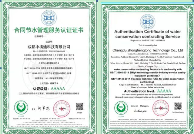 經(jīng)審查復(fù)核、認證評定、批準注冊,2021年4月12日,成都中橫通科技有限公司成功獲得《合同節(jié)水管理服務(wù)認證證書》!